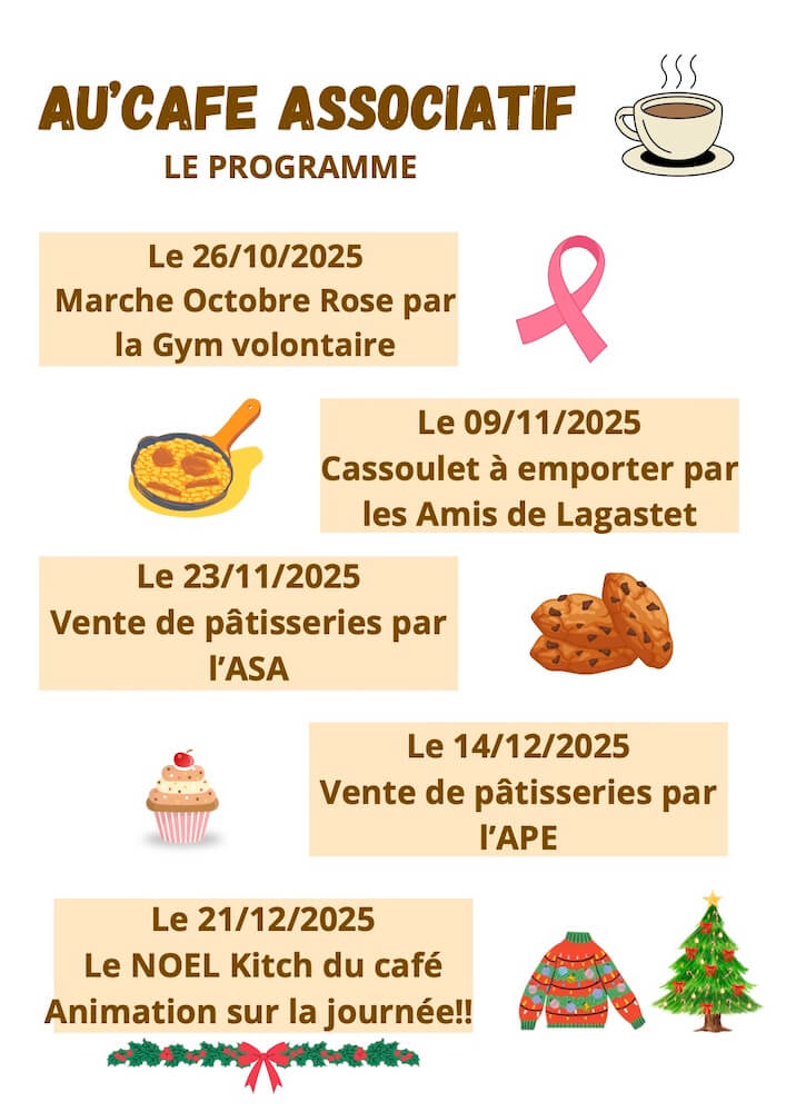 En novembre, place à la gastronomie et à la gourmandise : un délicieux cassoulet à emporter régalera les amateurs de plats traditionnels, suivi par deux ventes de pâtisseries proposées par les Amis de Lagastet, l’ASA et l’APE. De quoi se faire plaisir tout en soutenant les initiatives du village.