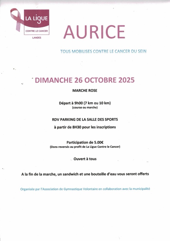 L’Association de Gymnastique Volontaire, en collaboration avec la municipalité, organise une Marche Rose le dimanche 26 octobre 2025, dans le cadre de la mobilisation contre le cancer du sein.