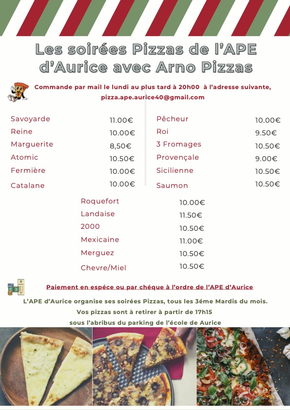 L’Association des Parents d’Élèves organise sa prochaine soirée pizza le mardi 18 novembre. Comme chaque mois, l’APE propose cette vente conviviale qui a lieu tous les 3ᵉ mardis du mois, afin de soutenir les projets éducatifs et les activités de l’école d’Aurice.